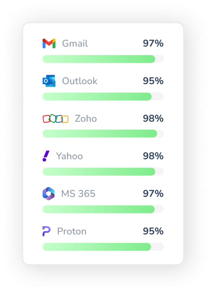 Example: Warmy’s email deliverability test gives you a comprehensive view of how well your emails are performing across various providers. It shows you if your emails are landing in inboxes or spam folders of email service providers (ESPs) like Gmail, Yahoo, or Outlook. This will allow you to identify any issues early and take proactive steps to resolve them, ensuring higher engagement rates.